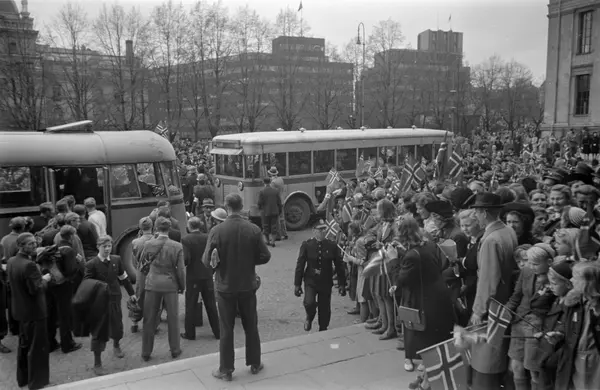 Universitetet, trapp, menn, løslatte Grinifanger, busser, tilskuere, flagg