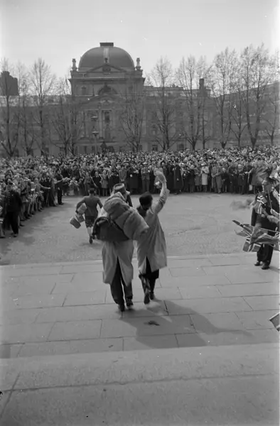 Universitetet, trapp, plass, menn, løslatte Grinifanger, tilskuere, flagg, Nationaltheatret