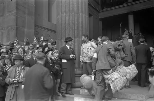 Universitetet, trapp, menn, løslatte Grinifanger, tilskuere, flagg