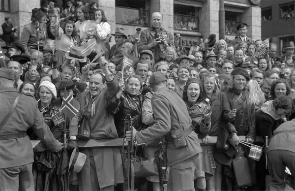 Rådhusplassen, kongens hjemkomst etter krigen, tilskuere, flagg, soldater, kontorbygninger