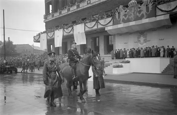 Rådhusplassen, kongens hjemkomst etter krigen, ridende politi, hester, tilskuere, Rådhuset