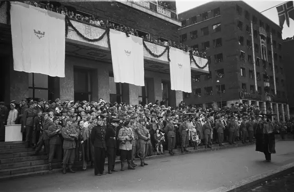 Rådhusplassen, kongens hjemkomst etter krigen, Rådhuset, trapp, tilskuere, soldater, banner, kontorbygning, flagg