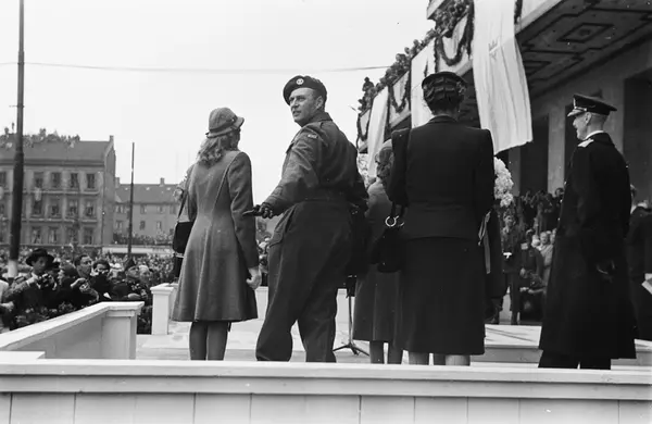 Rådhusplassen, kongens hjemkomst etter krigen, konge, kronprinsesse, kronprins, prinsesse, Rådhuset, trapp, balkong, tilskuere, pressefotografer