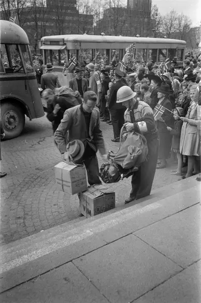 Universitetet, trapp, menn, kvinner, løslatte Grinifanger, busser, tilskuere, flagg