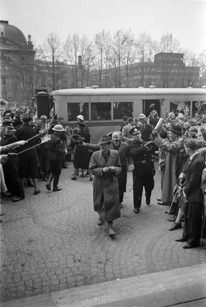 Universitetet, trapp, menn, kvinner, løslatte Grinifanger, busser, tilskuere, flagg