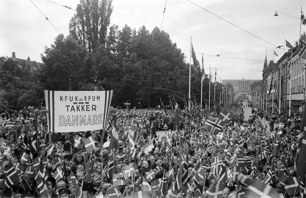 folketog, mennesker, flagg, banner: "K.F.U.K. og K.F.U.M. takker Danmark", forretningsgårder, park, Slottet