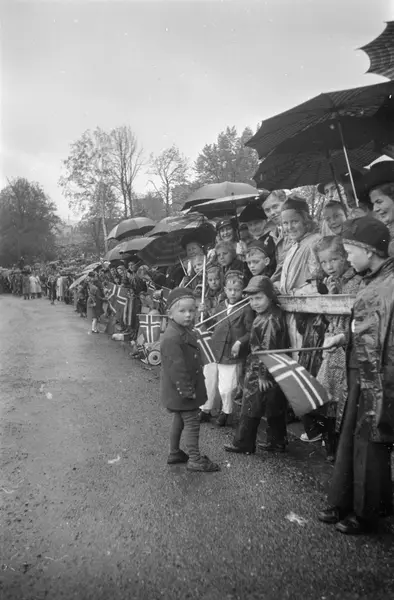 17. mai-feiring, tilskuere til 17. mai-tog, barn, flagg, kvinner, menn, paraplyer, regnvær