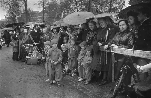 17. mai-feiring, tilskuere til 17. mai-tog, barn, flagg, kvinner, menn, paraplyer, regnvær
