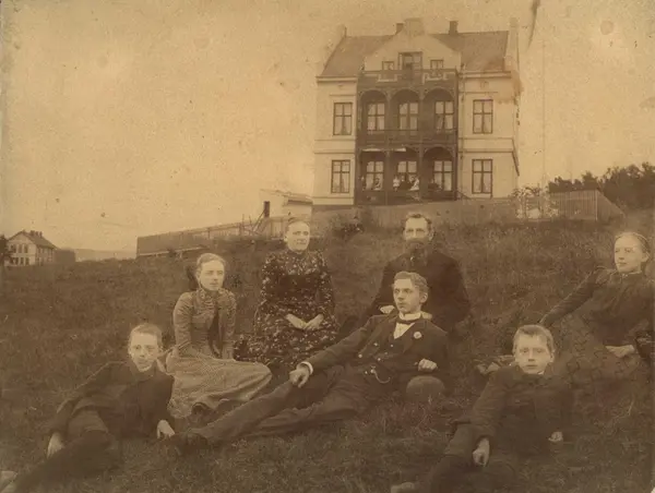 Bildet viser grosserer Ole Bernhard Nilsen og hustru Elen med sine barn foran Ullevålsveien 73 som han oppførte i 1889. Fra venstre: Sverre, Elna Kaspara, Elen, Ole Bernhard. Foran ham: Jonn Paulin, Eivind, Birgit Erline. Bildet må være tatt på 1890-tallet da nabogårdeen til høyre ble oppført i 1898. Familiegruppen sitter i skrenten til det som senere ble utsprengt til fremføring av Sofies gate. Fotograf Thorkelsen var en venn av familien