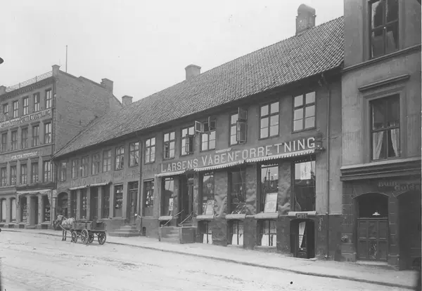 forretningsgårder, Larsens våpenforretning, café Paris, hest, kjerre