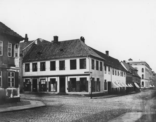 gateløp, bygårder, hjørnegård, forretninger, markiser, brostein, gatebelysning