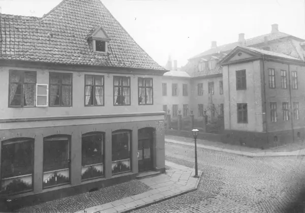 Bygården til venstre i bildet tilhørte Peder Anker, kammerherre, godseier til Bogstad og Nordmarka. Senere hans datter Karen Anker gift med grev Herman Wedel Jarlsberg. Grev Wedels mor, Catharina von Storm, hadde vokst opp i den gamle krigsskolen til høyre i bildet, som da ble kalt det stormske palé etter hennes far Caspar Herman von Storm. Ca. 1870 fikk gården til venstre (Peder Ankers tidligere bygård) første etasje innredet til butikklokaler.