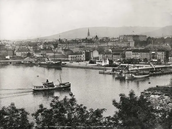 fjord, havn, dampbåter, seilfartøyer, Vestbanestasjonen, bygårder, Victoria terrasse, Slottet, Uranienborg kirke