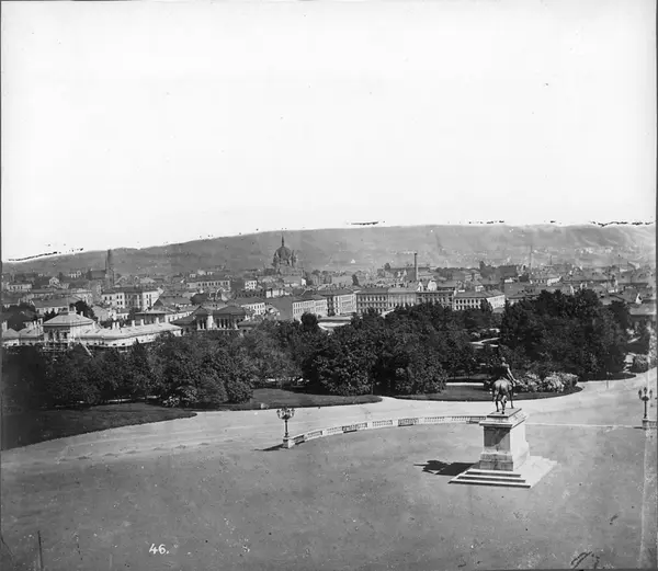 utsikt nordøst, plass, rytterstatue, park, bygårder, Norges Geografiske Oppmåling, Kjemibygget, St. Olav kirke, Trefoldighetskirken
