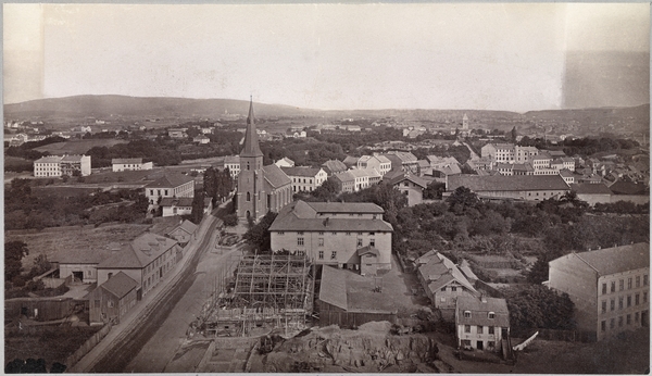 utsikt nord, gateløp, St. Olav Domkirke, bygårder, byggevirksomhet, Akersgatens misjonshus, Eugenia stiftelse, løkkebebyggelse, Gamle Aker kirke, Brandts løkke