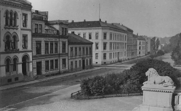 gateløp, bygårder, Wischmann fotoatelier, løveskulptur, park