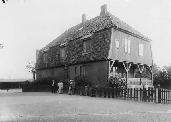 Foss skoles skolegård, Øvre Foss gård, bolighus, stakitt, port, hage, menn, kvinner