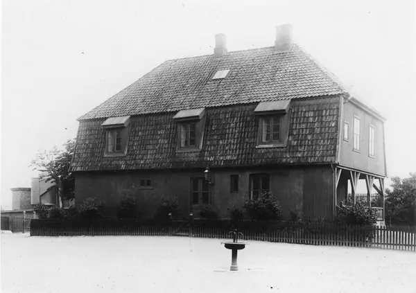 Foss skoles skolegård, drikkefontene, Øvre Foss gård, bolighus, stakitt, port, hage, menn, kvinner