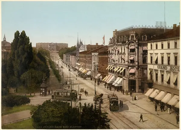 gateløp, Grand Hotel, Hotell Nobel, forretningsgårder, trikker, mennesker, gateliv, Slottet, park, kiosk