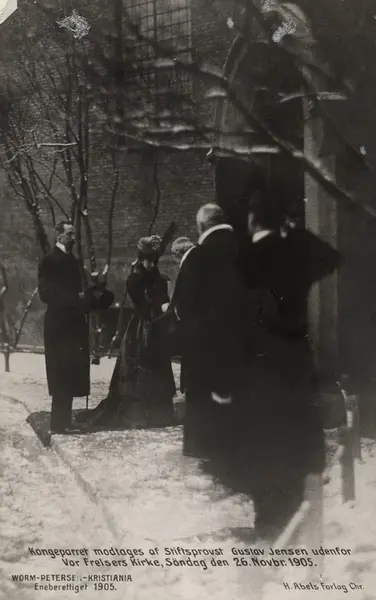 Kongeparret modtages af stiftsprost Gustav Jensen udenfor Vor Frelsers Kirke, Söndag den 26. Novbr. 1905.