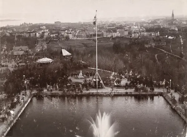 utsikt syd, vannbasseng, fontene, mennesker, portrettstatue, Slottet, Frydenlunds bryggeri, løkker, bygårder