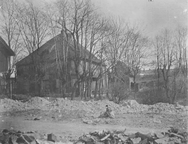 Løkken Frydenlunds siste dager - trolig i 1893. Gatenett og leiegårder spiser seg inn på siste rest av løkkeeiendommen. I forgrunnen anlegges øvre del av Frydenlundgata. Hunden til en av Christensen-brødrene ligger på gatefyllingen. Bak husene går Ullevålsveien. Pipene og taket i bakgrunnen tilhører leiegårder mot Waldemar Thranes gate. I venstre bildekant skimtes stabburet, deretter våningshuset. Richard Andersens samling