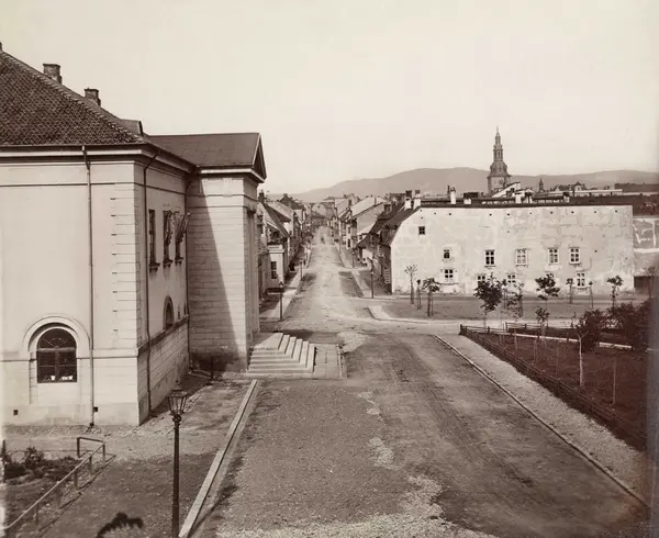 gateløp, Norges Bank I, park, bygårder, gatebelysning, kirkespir