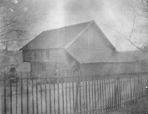 Ladebygningen (stabburet) med skjul på Frydenlund løkke (fra 1850-årene kalt Christensens løkke). I forgrunnen går Ullevålsveien mellom gjerder til løkken og St. Hanshaugen. I dag går Frydenlundgata ned til venstre der bygningen(e) ligger. Bak personen til venstre skimtes spiret på Vestre Aker kirke.