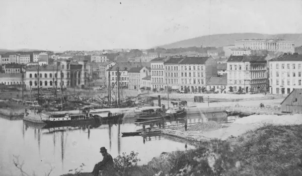 utsikt, mann, havn, dampbåt Louise (den eldste), seilfartøy, bygårder, Vestbanestasjonen, Slottet, brigadelege Sciøtts hus