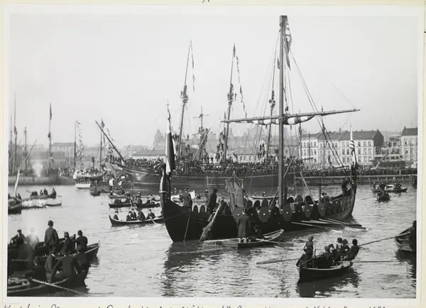 vikingskip (kopi av Gokstadskipet), avreise til Chicago, seilskip, småbåter, publikum, bygårder