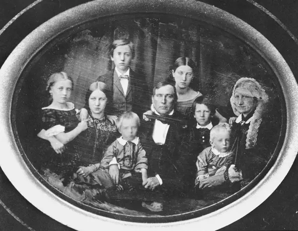 Mannen i midten er Peder Alstrup Jordhøy Berg (1808–1871). Hans hustru (till høyre i bildet) var Henriette Marie, født Hauge (1812–1904). De to barna bakerst i er Olof Petter Sofus Berg (1841–1919) og Emma Jahanne Andrea, gift Lund (1843–1924). De to jentene till venstre er Marie Olivia Jørgine, gift Solem (1844–1930) og Adeleide Pauline, gift (statsminister) Stang (1840–1930). Avfotografert daguerreotypi hos fru oberstløytnant Figenbaum.