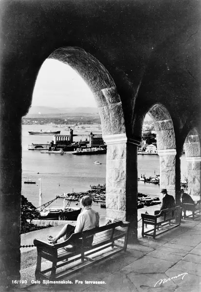 Sjømannsskolen, terrasse, benker, mennesker, søyler, utsikt, havn
