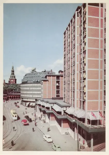 Hotell Viking, markiser, flagg, biler, trikk, forretningsgård, Oslo Domkirke, basarer
