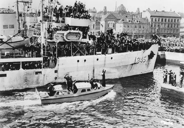 Kronprins Olavs hjemkomst, havn, marinefartøy HMS Cynthia, båt, mennesker