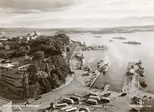 utsikt, bussholdeplass, busser, Skansen restaurant, Akershus festning, vei, jernbanelinje, Havnebanen, havn, skip, marinefartøyer