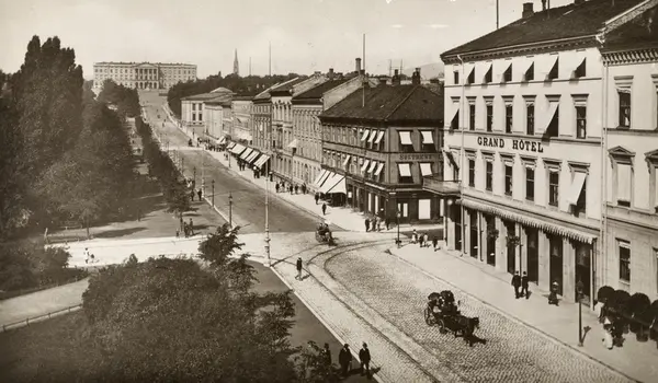 utsikt, gateløp, Grand Hotel, Søstrene Larsens hotell, forretningsgårder, hestekjøretøyer, gatebelysning, park, Slottet
