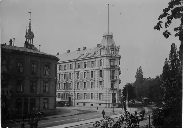 gateløp, bygårder, mennesker, hestekjøretøyer, trikk, park