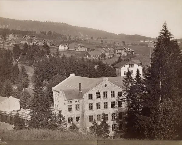 Nydalens Compagnie, høyre del av utsikt, fabrikkbygninger, arbeiderboliger, kulturlandskap, skog, barn2