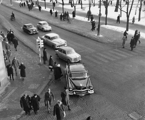 Bilen nærmest er en Caddilac 62 Sedan med registreringsnummer A-84637, eid av DNC (Den Norske Creditbank). Bak denne: Fiat 1200, Chevrolet 1953, Jaguar (nærmest fortauet) og DKW.