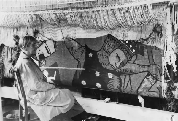 portrett, kvinne, billedveverske, sittende knefigur ved vevstol, veggteppe, Harald Hardråde-teppet