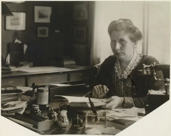 portrett, kvinne, teolog, sosialarbeider, sittende halvfigur ved skrivebord