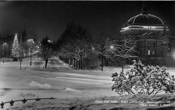Oslo ved natt. Karl Johansgt. Nationalteatret.