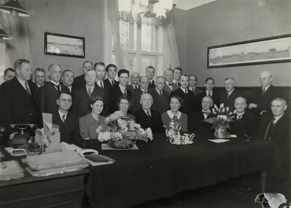 50-årsjubileum for oppmålingsbetjent Karl Johansen i Oslo kommune, gruppe, menn, kvinner