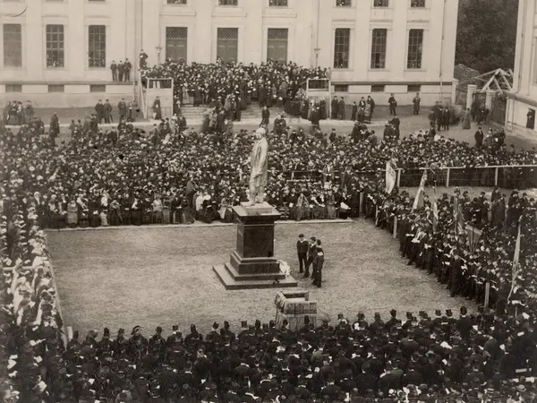 plass, avduking av portrettstatue, talerstol, publikum, faner