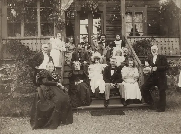 villa Furulund, veranda, trapp, gruppe, menn, kvinner, jente, flagg