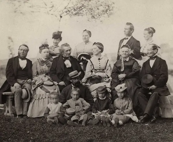 Stående bak fra venstre: ukjent, Agnes Keyser, Carl Hauge, Louise Hauge. Sittende fra venstre: Wilhelm Carlsen, ukjent, Christian Nielsen Brinch, Gunhild Marie Hauge, Anne Cathrine Brinch, Fredrik Wilhelm Keyser. Foran: Marthinius Christian Brinch med sønnene Christian og Rudolf.