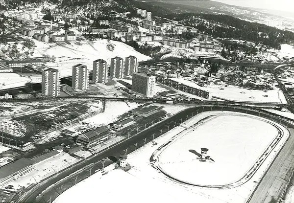 Bjerke travbane, veier, blokkbebyggelse, skog, snø
