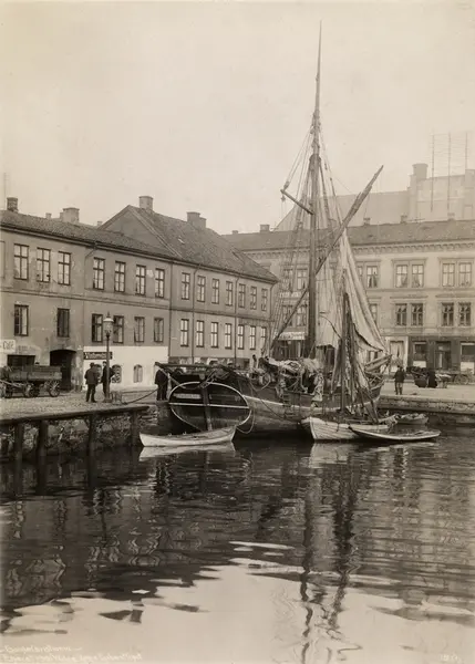 havn, seilfartøy, jakt "Nordkap", småbåter, bygårder, vinforretning, menn