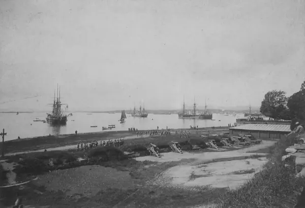 festningsvoller, Strandbatteriet (Ekserserbatteriet på Vippetangen), kanoner, soldater, strand, utsikt, fjord, seilskip