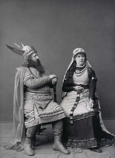 dobbeltportrett, kvinne, mann, skuespillere, rollebilde, Hjørdis og Ørnulf i "Hærmendene på Helgeland" på Christiania Theater, sittende helfigur, kostymer